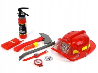 Zestaw zawiera: kask, gaśnicę, toporek, łom, imitację krótkofalówki, latarkę, odznakę, zegarek